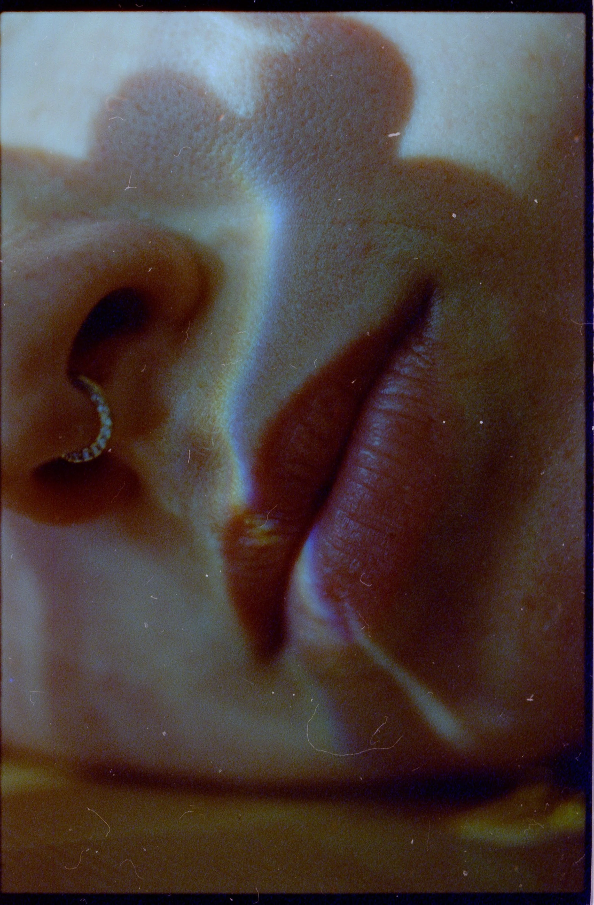 Ein spontan entstandenes Bild. Das Spektrum eines Glases bildet sich sanft über den Lippen ab. Durch die Schattengebung entsteht eine Silhouette zweier sich Küssender.